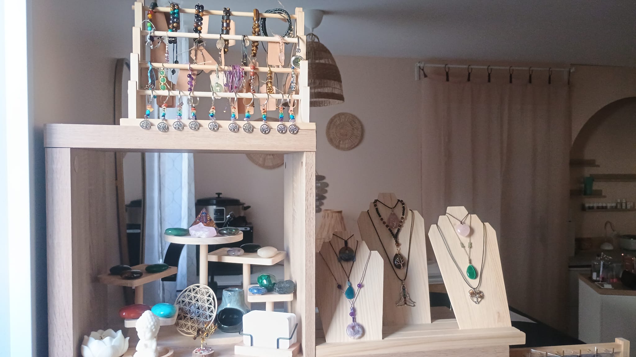 Enfin, je partage aussi mes créations artisanales – bijoux, bougies, pierres naturelles – lors de ventes en salons pour prolonger les bienfaits des soins à la maison.